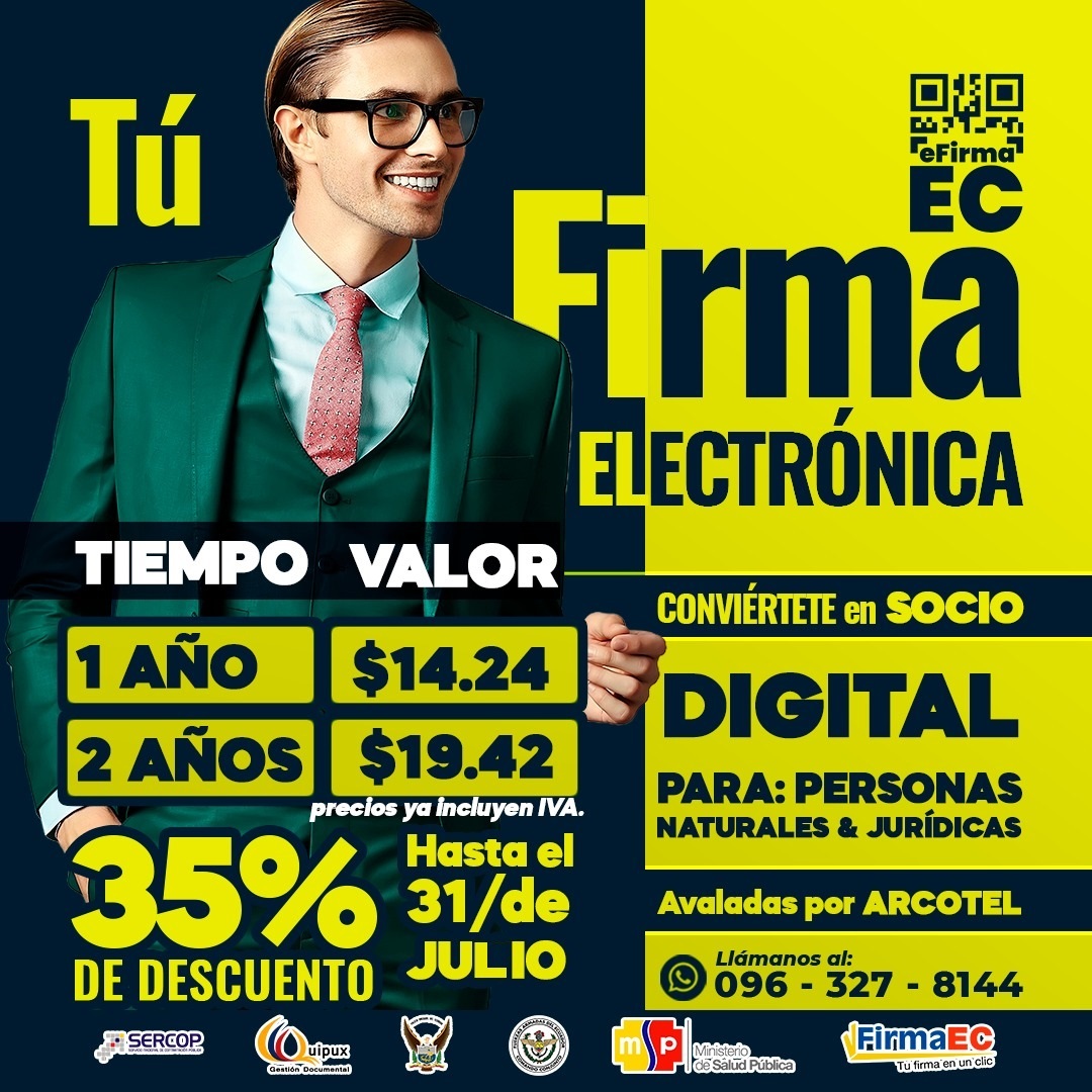 Somos una empresa ecuatoriana administrada por profesionales, legalmente constituida en la Superintendencia de Compañias y SRI., dedicada a la emisión, venta y distribución de firmas y facturas electrónicas, contamos con los planes mas economicos del mercado.